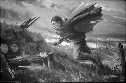 20 августа 1944 года в бою под с. Талмаз Молдавской ССР сержант П. Банников был тяжело ранен, но не покинул поля брани. В критический момент рванулся к дзоту, закрыл его своей грудью, пулемёт захлебнулся, а рота с перекатным «У-р-ра!» устремилась на талмазские высоты. Село было освобождено от немецко-румынских оккупантов. П. Банников посмертно награждён орденом Отечественной войны I степени… Цветовая серо-зелёная гамма полотна, стремительный, резкий рывок вперёд солдата, развевающийся плащ подчёркивают динамику и внутреннюю силу героя. На заднем плане видны объятые пламенем крыши домов, деревья, руины. Напряжённое небо намеренно дисгармонично: нежно-голубые цвета переходят в серо-синие.
