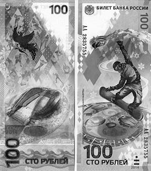 К Олимпиаде-2014 Банком России выпущена памятная банкнота номиналом 100 рублей. Общий тираж банкноты – 20 млн экземпляров. Это первая российская вертикально ориентированная банкнота.