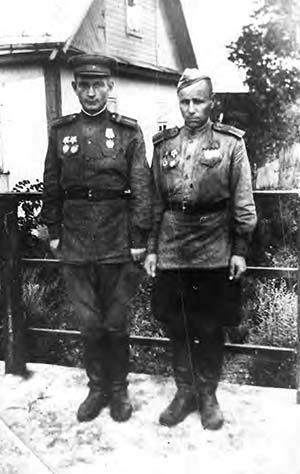На фотографиях, сделанных в самом конце войны, старшина Телятников Павел Аксенович (слева) запечатлен неизвестным фотографом при полном параде, с орденами и медалями, вместе с однополчанином.