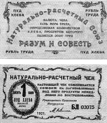 В 1921 году, во время безудержной гиперинфляции советских рублей и голода, Киевским Натурсоюзом были выпущены расчётные чеки достоинством 1 пуд хлеба. Натурчеки были выпущены номиналом 1, 2, 5, 10, 20 натуррублей или пудов. Сообщалось, что «наименьшая купюра натурчека Союза равна 1 натуркопейке, составляющей 1/100 пуда ржаной муки, 10 натуркопеек составляют 1 пай, а 100 натуркопеек — 1 натуральный рубль (пуд ржаной муки)».