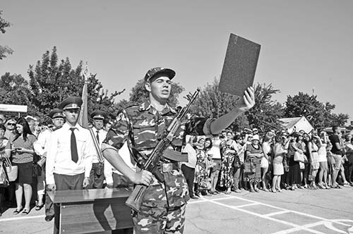 Присяга-6В этот день призывники различных родов Вооруженных сил выстроились в пешем строю в парадной форме. Взволнованные и серьезные, они ждали минуты, когда прозвучит текст военной присяги перед родными и близкими, которые в большом числе окружили плац, выискивая глазами в однообразном воинском строю свою кровиночку.