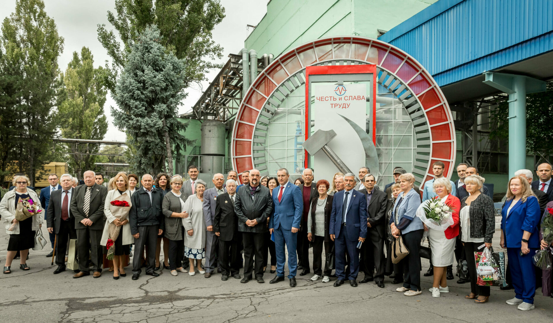 Праздник начался сразу за проходной – под бравурные фанфары торжественно открыли стелу «Честь и слава труду» в обрамлении круглой арки с выступами. Арка, как выяснилось, символизировала корпус электрической машины (и правда, была похожа на электродвигатель в разрезе). Стальные серп и молот, понятно, символизировали труд. Все вместе назвали арт-объектом, хотя на табличке рядом было написано «памятный знак».