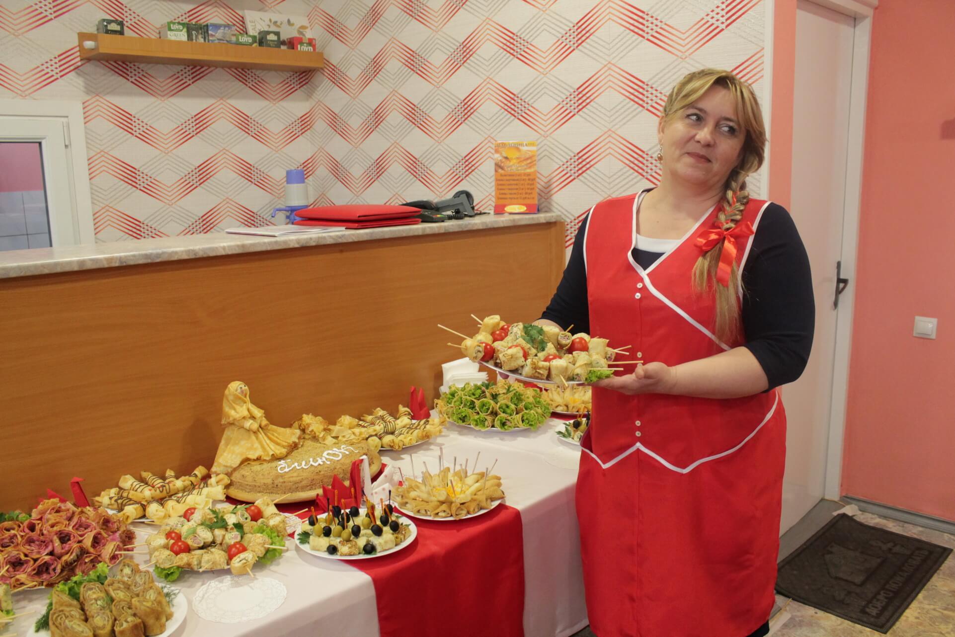 – В самом начале деятельности основным блюдом кафе были блины с различной начинкой, отсюда и название кафе – «БлинОк». Со временем ассортимент продукции расширялся и сегодня составляет около полусотни блюд. Особым спросом по-прежнему пользуются наши блинчики, перец фаршированный, различные котлеты, фрикадельки, мититеи, а также разноцветные вареники – желтые, красные, оранжевые, зелёные. Вместо краски – куркума, сок моркови, свеклы, петрушки и шпината. А посмотрите, какие у нас красивые голубцы, какая яркая и вкусная заправка для борща! Повара могут приготовить любое блюдо. Нам заказывали продукты на юбилей – и холодец, и фаршированную рыбу, и заливное. Мы готовим еду на любой вкус. Сейчас у православных христиан Великий пост, и в ассортименте появились постные блюда. В частности, голубцы с грибами, блинчики и вареники с картошкой, капустой, грибами. А на еврейский праздник – традиционные еврейские блюда. Город у нас многонациональный, и мы готовы и способны приготовить любое национальное блюдо.