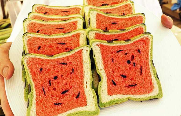 Бендерский хлебокомбинат выпустил новый вид хлеба – в разрезе он как настоящий арбуз: с зелёной корочкой (шкурка), красным мякишем (алая мякоть) и изюмом (имитирует арбузные косточки).