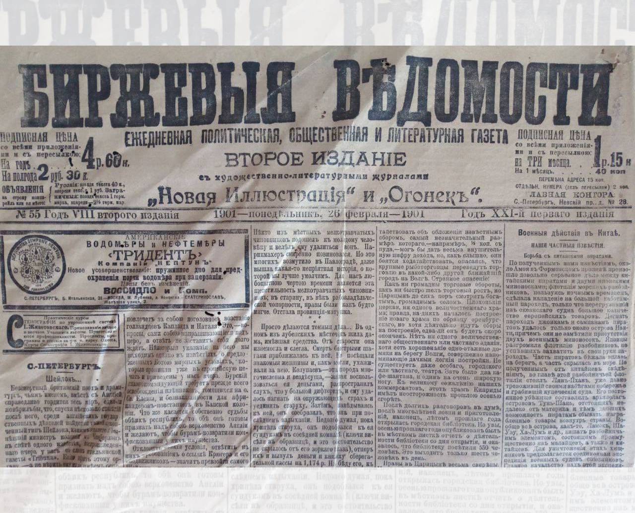 В «Биржевых ведомостях» находим яркие исторические свидетельства. Например, новость о покушении на германского кайзера Вильгельма II, произошедшем в марте 1901 года. «До сих пор ещё не установлено, как был ранен кайзер, – отмечают ведомости. – Рана могла быть нанесена только тупым орудием, кинутым к тому же сверху вниз… Остановились было на мысли, что с какой-нибудь крыши упал камень на императора. Но против неё говорит то, что ни в экипаже, ни на месте покушения не было найдено и следа кирпича». Не этот ли эпизод вдохновил Михаила Булгакова на строчку: «Кирпич ни с того ни с сего, – внушительно перебил неизвестный, – никому и никогда на голову не свалится»?