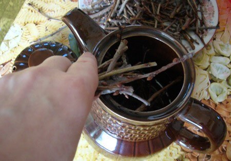 Ароматный густой напиток он делал в огромном ведерном чайнике на печке. Укладывал веточки смородины, вишни и малины. Если чай делал зимой, то для этого срезал прихваченные морозом сизо-бордовые молодые побеги плодовых деревьев и кустов. Если весной, то лучше всего, говорил, нарезать веточки, когда началось движение сока внутри дерева и появились почки. На 100 граммов веточек надо 2-3 литра воды и сахара или мёда по вкусу. Как только вода закипит, забросить веточки и пару минут поварить. Потом снять с огня и дать 15 минут настояться. Обязательно процедить через ситечко. Когда чай будет выпит, в запаренные побеги можно добавить ещё кипятка и оставить настаиваться уже на час. «Второй отвар» из веток смородины и малины даже вкуснее.