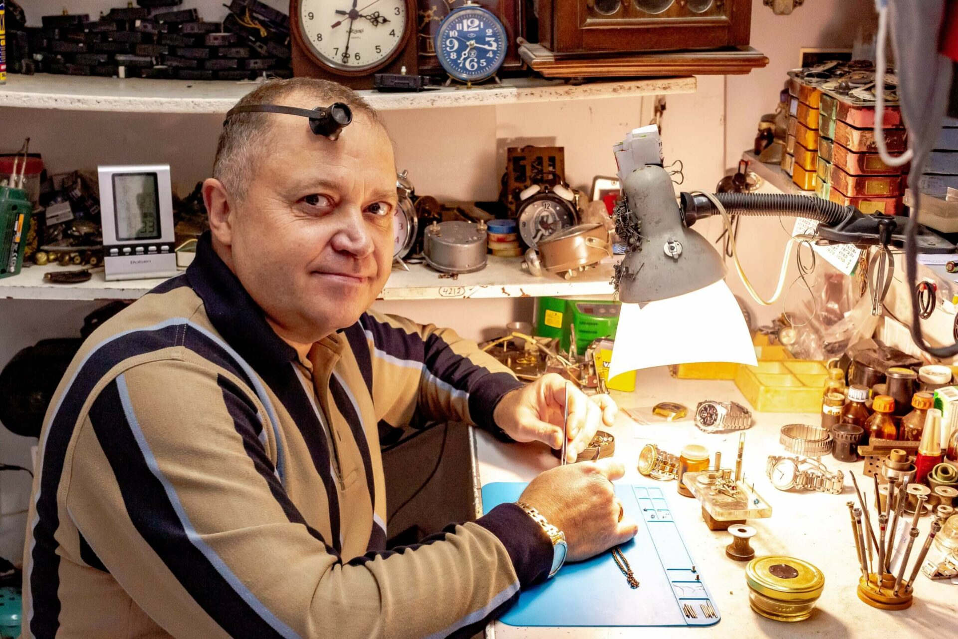 В часовой мастерской Игоря Клименко, маленькой, но уютно расположившейся в бывшем здании Дома быта на перекрестке улиц Шевченко и Карла Либкнехта в Тирасполе, все спланировано. Стол с массой миниатюрных инструментов и ящичками в тумбе, наполненными разными деталями. На нем – настольная лампа, без которой никак нельзя. Она светит даже в ясный день, так как надо увидеть каждый мельчайший узел сложного механизма. А за столом сам мастер – с привычной на лбу многократно увеличивающей лупой.