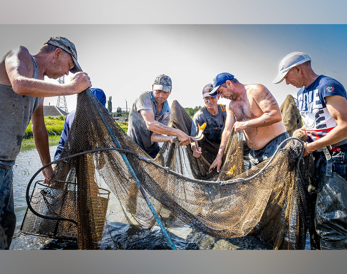 Чтобы объехать в баркасе главное озеро по периметру, требуется полтора-два часа. Увы, из-за ограниченного времени мы не попали на рыбалку, которую здесь шутя зовут «дискотекой». Дело в том, что рыба не дура, и когда рыбаки тянут сеть, она всячески старается либо увернуться, либо выпрыгнуть из неё. Особенно прыгучи белые «ядрёные» толстолобики, да и крупный усатый карп порой может так «залепить» рыбаку в лицо либо в любую другую часть тела, что «мало не покажется». Судак – тот ведёт себя поспокойнее, но зато порезы от его острых плавников долго не заживают. В общем, работа не только физически трудная, но и травмоопасная, рыбакам остаётся надеяться на везение. Ежедневно, круглый год рыбхоз развозит на продажу свежевыловленную рыбу. Летом дополнительные трудности создаёт жара, зимой – холод. Подлёдная рыбалка сетью, когда вода на озёрах рыбхоза замерзает, – это, по словам бригадира, настоящее испытание. Под защитный резиновый костюм одеваются тёплые свитера и куртки, ведь нужно лезть прямо в ледяную воду. Лёд взламывают вдоль берега, под него запускают невод. Начинается настоящая страда, требующий напряжения всех сил сбор живого, строптивого «урожая». Карпы, например, любят прятаться в норах, которые сами роют, рыбаки их оттуда выгоняют, что не так уж просто. Летом бригада составляет обычно 8 человек, осенью и зимой, когда работы прибавляется, – минимум 12. В прошлом году на пике жары бригада работала с 6 до 12 часов, позже становилось невыносимо. В этом году пока ещё рабочий день длится с 8 до 17 часов, всё-таки обилие водных поверхностей плюс ветер освежают воздух.