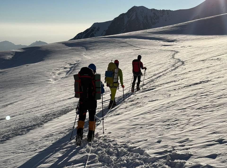 1 июля в 3 часа ночи. Чтобы солнце не успело подтопить снег и было комфортно идти, направились ко второму лагерю. Путь от первого до второго планировали пройти за 7-8 часов, но в горах всегда бывают сюрпризы, иногда погодные, а иногда от тех, кто идёт с тобой рядом. К 4 часам утра один из гидов почувствовал себя хуже, отставал постоянно. У меня аптечка была под рукой, дал ему таблетки. Продолжили движение вверх.
