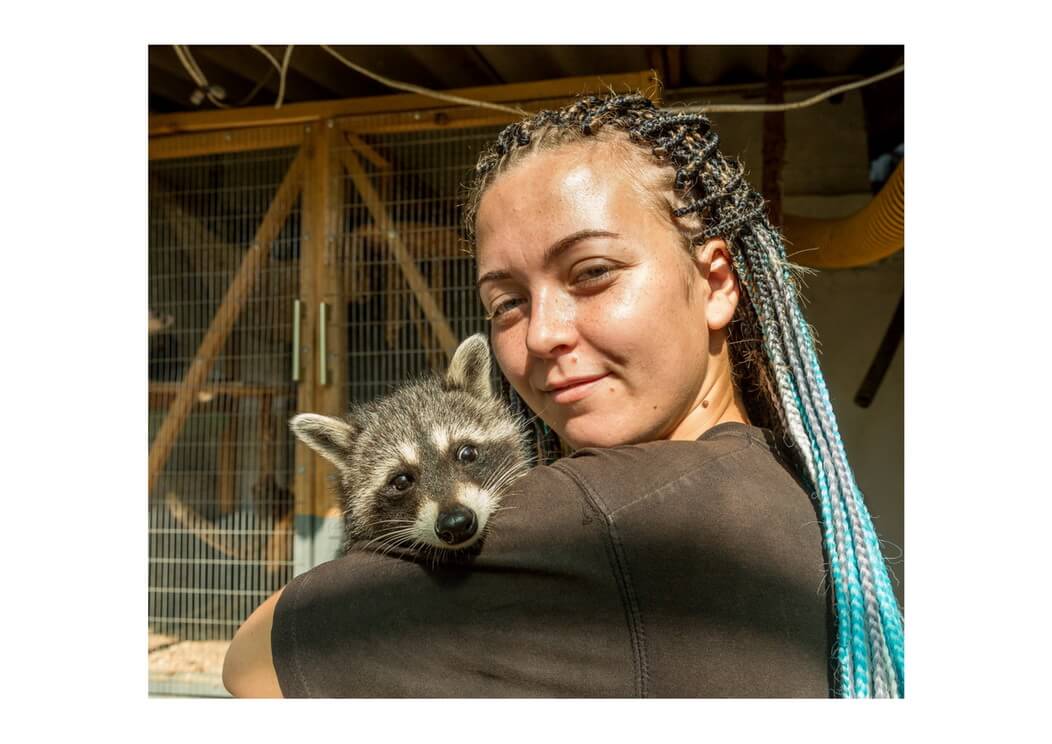 Их папу енота Грю удалось даже покормить. На руки его не берут – не потому, что он уже взрослый, причина в другом, однажды он сбежал. Пришлось искать. Через ограждение вольера Грю протягивал лапки за угощением – кукурузными палочками – и аккуратно брал их из рук. Если палочка падала, то сам нащупывал её за оградой и тянул в рот. Умное животное. Дал возможность покормить себя, наелся и ушёл обратно в своё жилище, быстро поднявшись по лесенке.