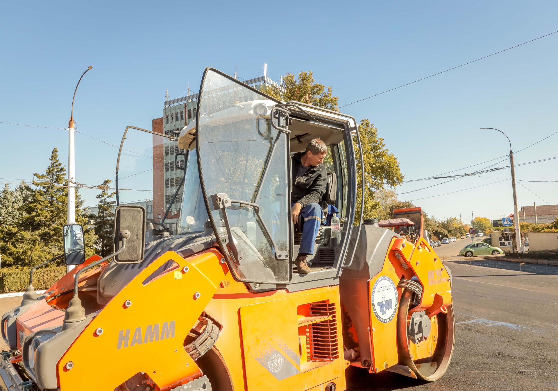 Водитель первого класса Юрий Сухович подвозит материалы на участок с асфальтобетонного завода. Подмечает: «Где мы делаем, там отличные дороги».