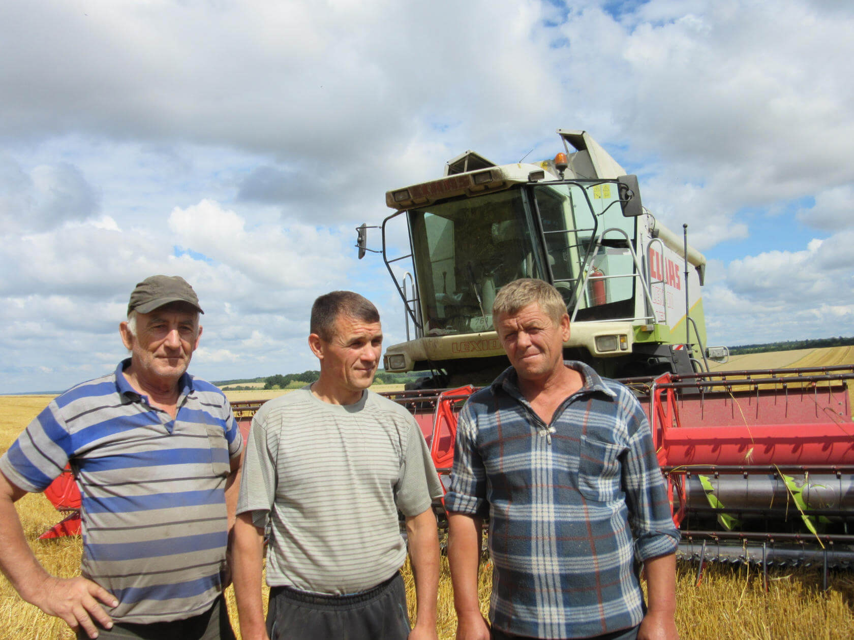 Возле комбайна собрались механизаторы Владимир Цымбалист, Константин Казак и Ефимий Даскал, которые ждут, пока подсохнет земля и можно будет продолжить уборку пшеницы. А пока они готовы поговорить с корреспондентом. Если выйдут в поле, будет не до разговоров…