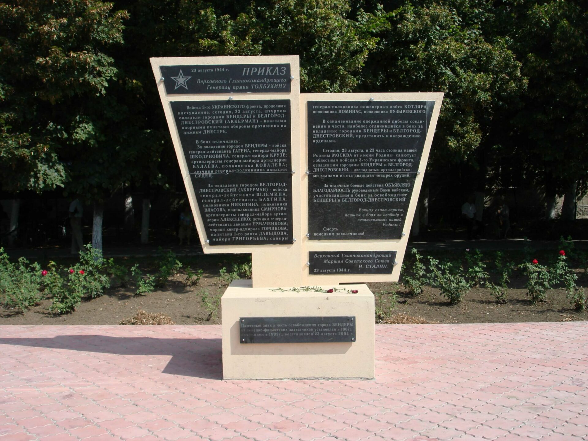 23 августа 1944 года были освобождены Бендеры. На следующий день все центральные газеты опубликовали Приказ Верховного Главнокомандующего генералу армии Толбухину (Федор Иванович Толбухин – командующий 3-м Украинским фронтом, будущий Маршал Советского Союза. – Прим. ред.) от 23 августа 1944 года. Его, выбитого на мраморной стеле, можно прочесть на бендерской центральной площади. В нём, в частности, говорилось, что за взятие Бендер и Белгород-Днестровского в 23.00 23 августа «столица нашей Родины Москва от имени Родины» салютует двенадцатью залпами из 124 орудий.