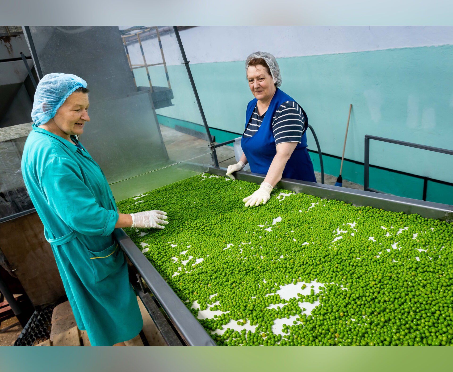 Мастер консервного цеха Людмила Коноваленко уточняет: на предприятии перерабатывают горошек из мозговых сортов – высшего качества, высшей степени зрелости. В течение часа он прямо с поля попадает в цеха – либо замораживается, либо консервируется. Перезревать не дают, это недопустимо по технологическим требованиям. Только что поступивший с поля горошек выгружают в бункер, оттуда по линии, на которой отделяется весь «мусор», он попадает в моечные машины. Далее бланширование, охлаждение, ещё раз – на селектор, где особенно тщательно отделяются, проходят инспекцию горошины. Потом расфасовка по банкам: выдаётся нужный вес, в каждую банку по 255 г. Доливается заливка (в составе соль и сахар), 160 г. После этого банки закатывают и стерилизуют. Выкладывают на поддоны, после чего готовый продукт попадает на склад, где отстаивается. Этикетки на банки клеят только через две недели.