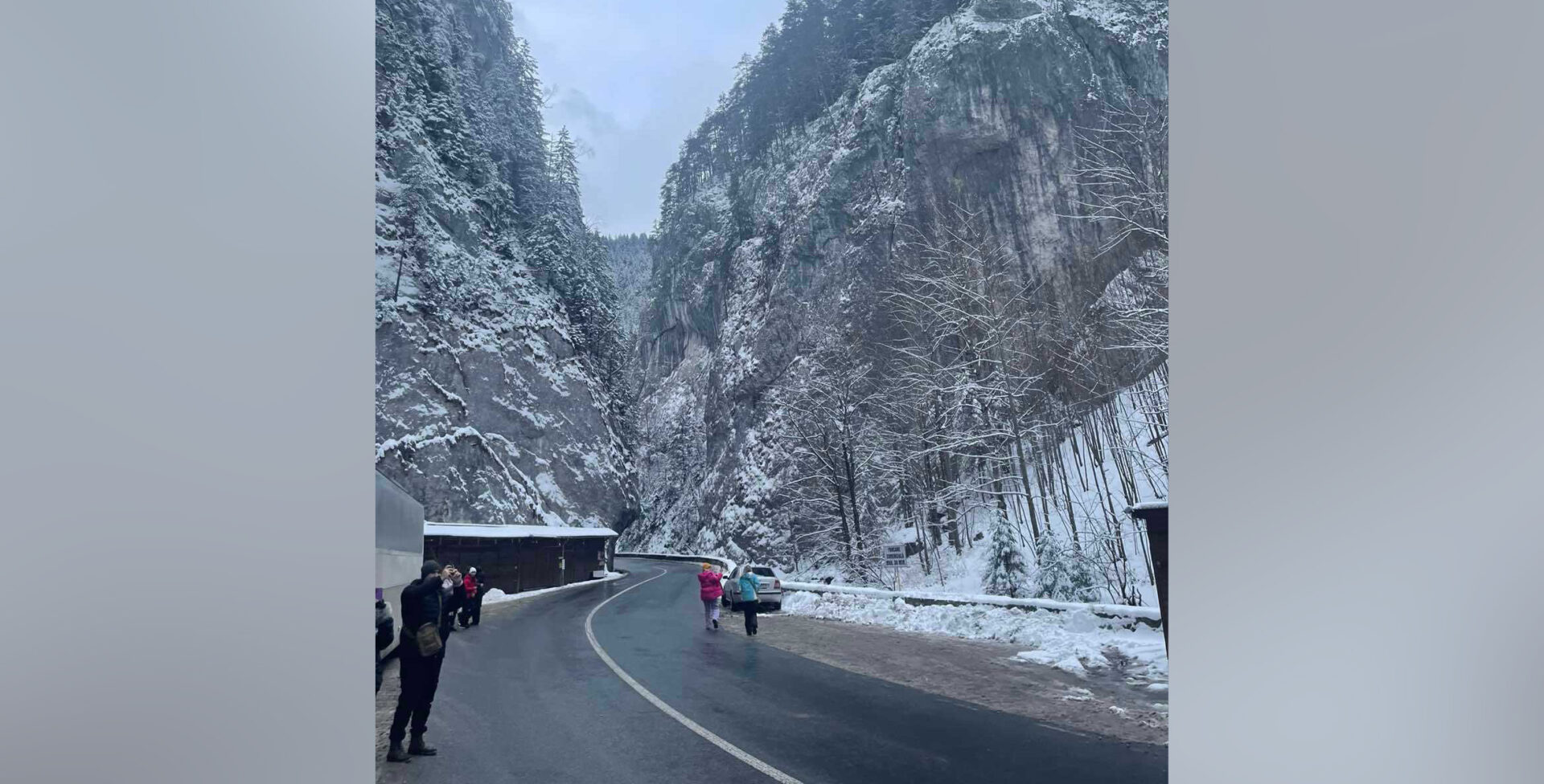 Затем мы отправились в заснеженное ущелье Биказ. Это яркое творение природы – самое длинное ущелье Румынии. Меня оно впечатлило, в первую очередь, непревзойдёнными скальными пейзажами. В ущелье мы приехали вечером, и наступающие сумерки добавили к мрачной красоте этого места ощущение чего-то таинственного. А если добавить к величественному ущелью туман – декорации к фильму про Дракулу готовы. Казалось, скалы вот-вот сомкнутся в узком просвете чернеющего неба. Здесь у нас было немного времени насладиться этой пугающей красотой и запечатлеть её на фото.