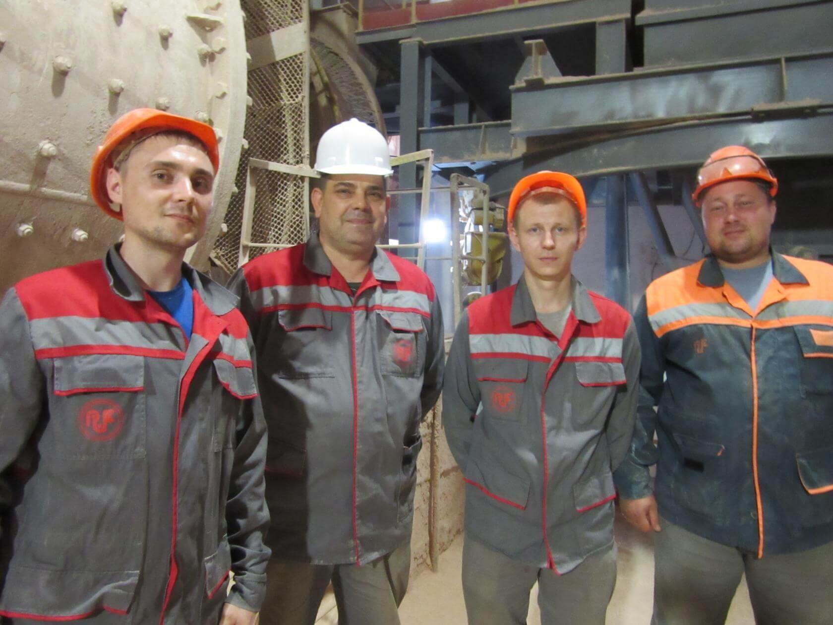 На снимке: (слева направо) помощник машиниста печи Артем Ерёмин, начальник сырьевого цеха Сергей Балашенко, сменный мастер Игорь Гушило, машинист крана Игорь Смешной.