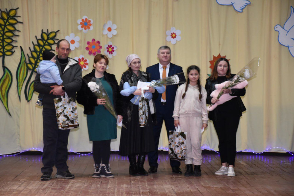 Всё, что происходило дальше, отличалось особой теплотой и душевностью. На сцену пригласили самых маленьких жителей села. Счастливыми родителями в течение года стали семьи Гордиенко, Полуэктовых, Киртока, Петриман, Бабчинецких и Блажиевских. И тут уже цветами и красивыми словами не обошлись – дарили подарки, как и семейным юбилярам.
