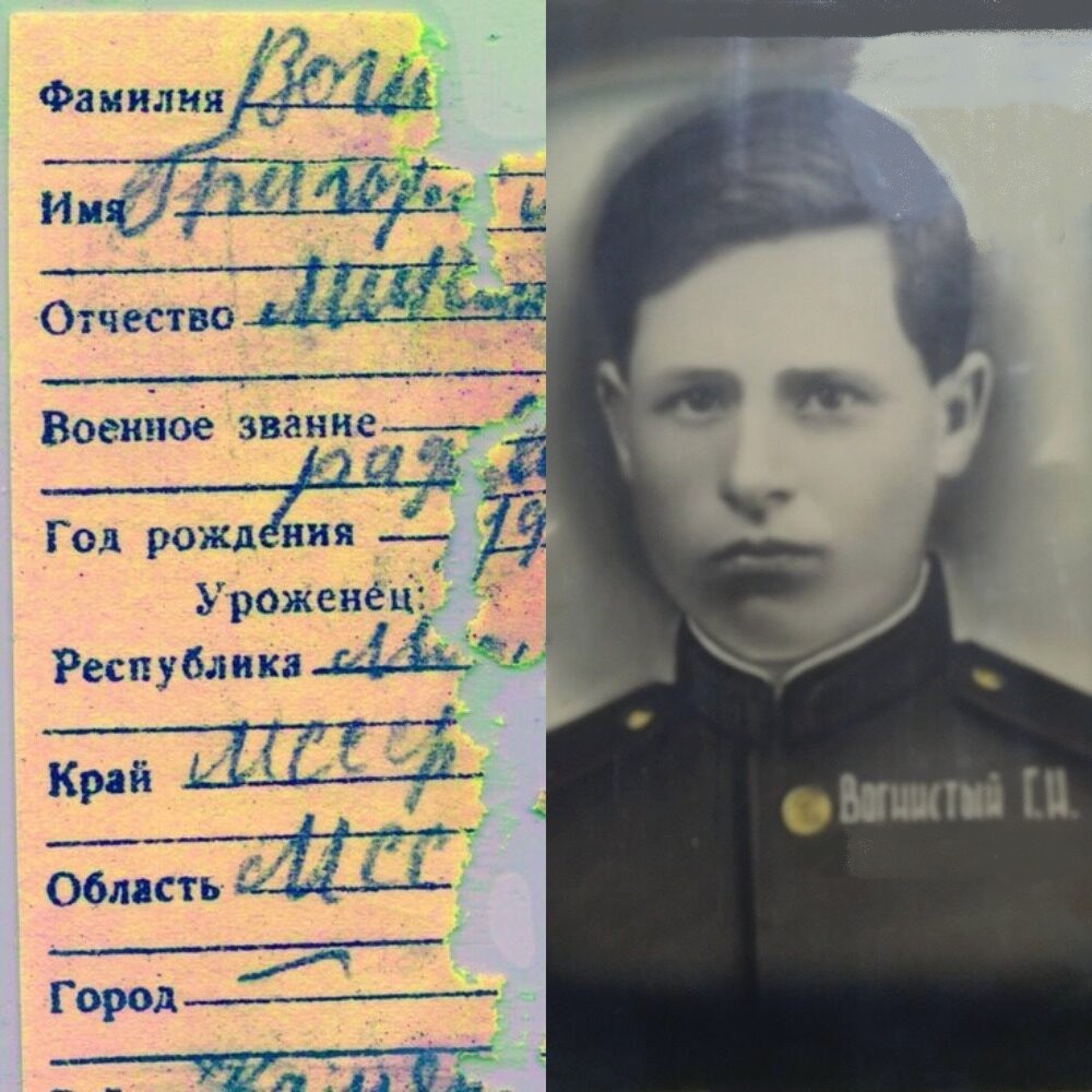 Уезжая в короткий отпуск в Бугучанский район Красноярского края, заместитель главы администрации Каховского района Херсонской области Роман Жаркомбаев взял медальон с собой и передал его журналисту «МК в Красноярске» Владиславу Пирогову. Сотрудница музея «Мемориал Победы» в Красноярске Елизавета Стручева отвезла медальон в Москву на конференцию представителей поисковых отрядов со всей страны «Судьба солдата» и передала председателю совета командиров поисковой экспедиции «Долина» Игорю Неофитову. Имя бойца удалось установить с помощью эксперта Андрея Фетисова и ребят из московской лаборатории «Солдатский медальон»: Вогнистый Григорий Никитович, 1911 года рождения, МССР, Каменский район, село Окница. Призван Каменским РВК в 1941 году, почтовый ящик № 40…».