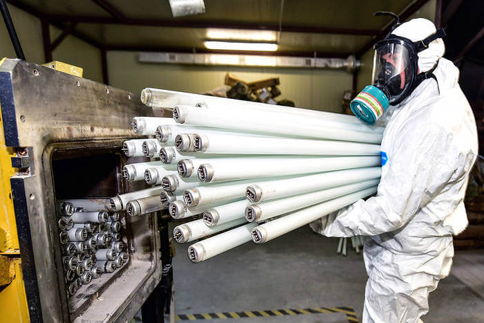Перерабатывает лампы и иные ртутьсодержащие приборы установка российского производства «Экотром-2 У», но в качестве резервной машины всегда есть более старое оборудование УДМ-3000. Сначала лампы перемалывают, потом в два этапа нагревают – до температуры 650°С и 950°С, и далее происходит отсос вредных паров. В итоге остаётся стекло (стеклобой) и металлические вставки, которые вывозят на полигон ТБО. В России им нашли применение в строительной отрасли.