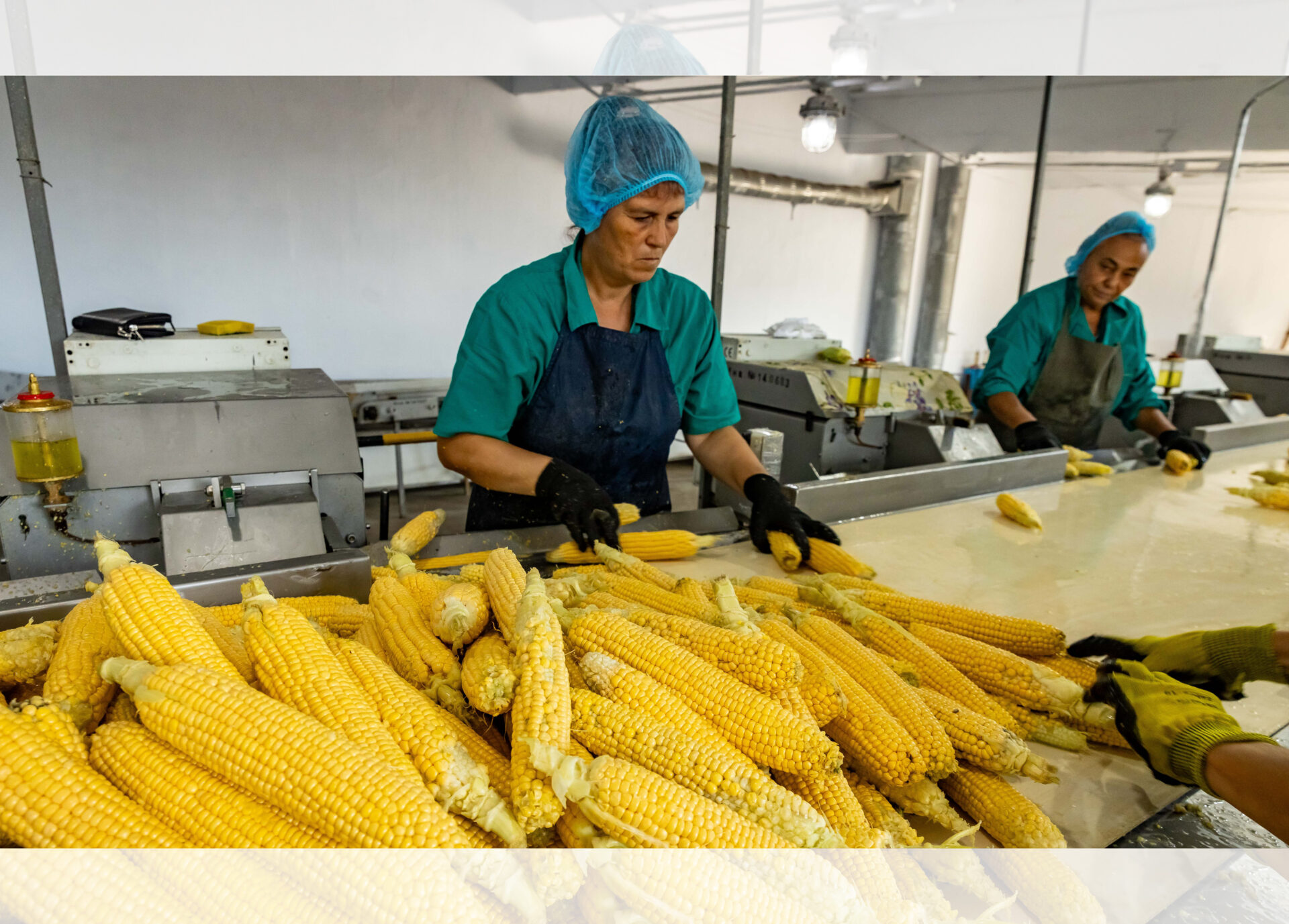 Весь процесс опытный технолог знает от и до. Сырьё (сегодня это кукуруза) поступает в весовую, затем разгружается в бункеры, откуда идёт на очистку початков от покровных листьев, на инспекцию початка (некондиция отбирается), а дальше по ленточному транспортёру кукуруза следует на куттеры, где происходит обрезка зёрен. Зёрна идут на мойку, после неё – на бланширование (тепловую обработку) с последующим охлаждением до +15°С. Следующий этап – скороморозильный аппарат (–25°С), где происходит шоковая заморозка кукурузных зёрен. Последняя точка – фасовка и складирование продукции.