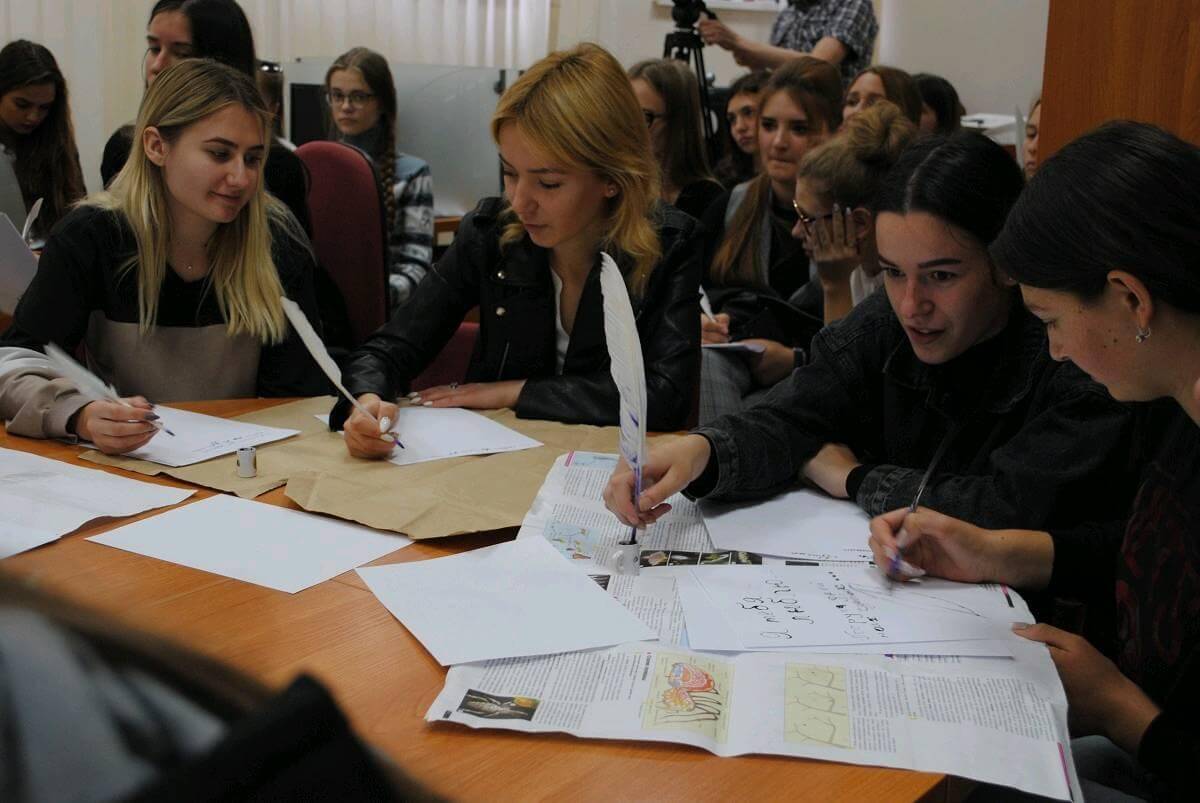Начальник службы просветительной и выставочной работы Пушкинского заповедника Алёна Бойцова провела урок письма «И пальцы тянутся к перу, перо к бумаге…», который ознакомил присутствующих с традициями эпистолярного жанра в пушкинское время и письменными принадлежностями XIX столетия. Взяв в руки гусиное перо и окунув его в чернила, студенты почувствовали себя в роли пушкинских героев и написали письмо, как это принято было во времена А.С. Пушкина.
