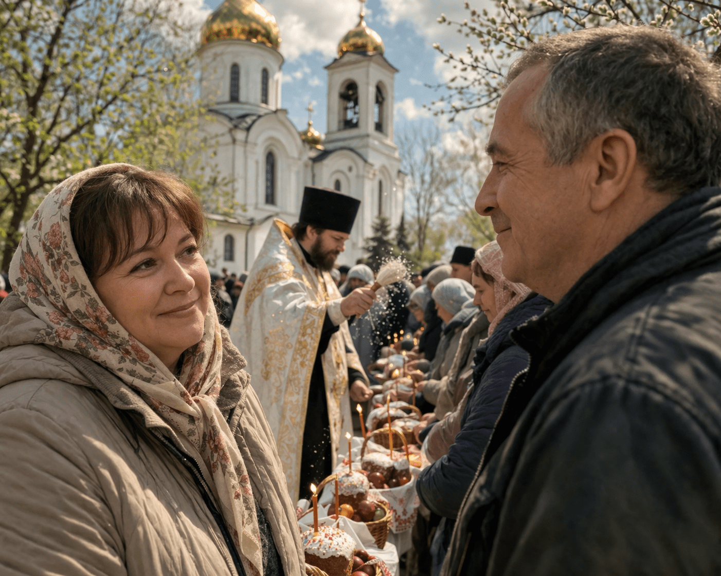 В церкви закончилась служба. Батюшка шёл вдоль ряда прихожан, выстроившихся для освящения пасхальной снеди. Он читал молитву, окроплял еду святой водой. И вдруг я почувствовал на себе взгляд женщины, стоявшей напротив. В её лице угадывались знакомые черты. Откуда я её знаю? Я пытался вспомнить, но тут двинулась новая толпа людей, и мне пришлось собираться.