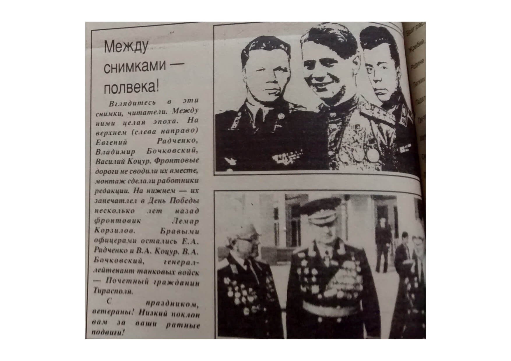 Связь времен запечатлена на двух любопытных фотографиях в этой же рубрике. На первом снимке – Евгений Радченко, Владимир Бочковский и Василий Коцур. Фронтовые дороги не сводили их вместе, монтаж сделали работники редакции. Другой известный фронтовик и по совместительству фотограф Лемар Корзилов застал воинов, оставшихся бравыми офицерами, на празднике в Тирасполе. Вот так рождается история!