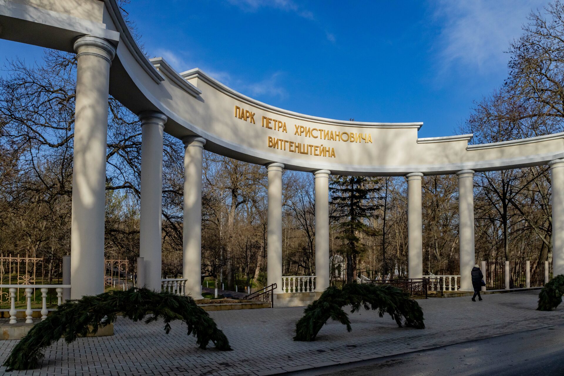 Спуск со склона в раскинувшийся прямо у его подножия парк имени П.Х. Витгенштейна оставляет впечатление перехода от почти первозданной дикости к содружеству природы и культуры, которое и составляет суть парка. На примерно 27 его гектарах, в лабиринте тенистых аллей, большая половина которых уже замощена тротуарной плиткой, там и сям разбросаны архитектурные элементы в стиле классицизма: ротонды, беседки, портики с колоннами, мостики через пока безводные каналы, разумеется, входная арка. Все это в едином стиле и цветовой гамме – благородная белизна оттенка слоновой кости. Относительно «молодой» бюст героя Отечественной войны 1812 года Витгенштейна расположен на одной линии с довольно внушительным мемориалом героям Великой Отечественной войны, сооруженным еще в советские годы. Есть также детская и спортивная площадки, роллердром. Благоприятное впечатление ухоженности дополняют стилизованные под старину фонари, новые скамейки и урны. Разумеется, все это хорошо только на фоне массы деревьев, молодых и старых (говорят, некоторые из них «помнят» самого Петра Витгенштейна). И это, что ни говори, здорово!