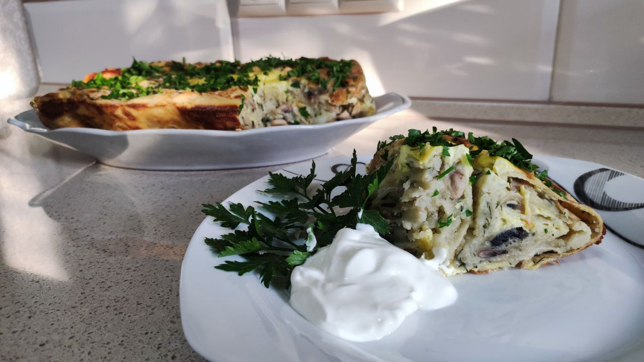 Кажется, там пюре двухдневной давности спряталось за маленькой горкой шампиньонов… А вот и фантазия – пунктуальная дама. Значит, банница. Только не с творогом – с картошкой и грибами.