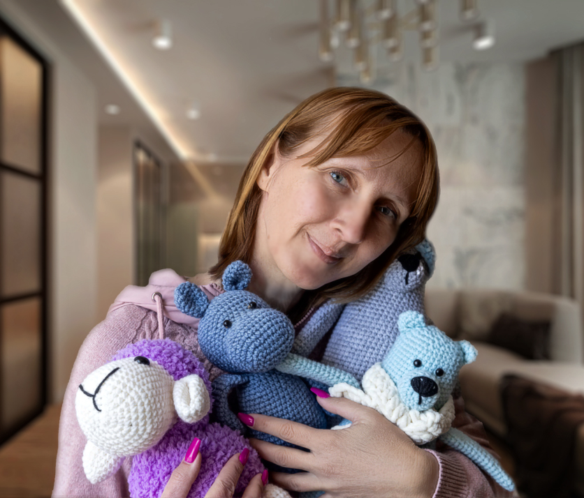 Наша героиня переехала с детьми из Тирасполя в Чобручи, где купила уютный домик, в одном крыле которого и мечтает обустроить студию. Открыла патент и вяжет в любую свободную минутку. «Младший сынок сначала не проявлял интереса к моим изделиям, посмотрит и убежит, – улыбается собеседница. – И тут появился Мишутка. Он его схватил, прижал к себе и несколько дней подряд и ел, и спал с ним. Я подумала тогда: «Нужно ещё такого связать!». Так появилась целая семья мишек. Потом я стала дарить игрушки детям, знакомым и даже незнакомым. В маршрутке, в школе. И увидела радость в их глазах. И поняла, что не зря этим занимаюсь». Её бегемотики напоминают муми-троллей из известной книжки и выполнены в пастельных тонах. Потому получаются по-настоящему сказочными, стильными и какими-то космическими. «Да, цветовой акцент очень важен, – соглашается с моими наблюдениями Полина. – Важно, чтобы вещь была приятной, но одновременно развивала воображение и мышление. Родители с ребёнком могут вместе связать такую, а потом и одежду для неё сшить. Даже если мама никогда ранее не брала иголку в руки. Я научу, это не так сложно. Часто вспоминаю детство, у меня была только одна кукла, Катя. И то она мне по наследству досталась. Думаю, если бы в моём детстве были такие игрушки, какие делаю сейчас сама, это было бы счастье и большое богатство. С ними можно играть «в театр», ставить сценки и разыгрывать по ролям».