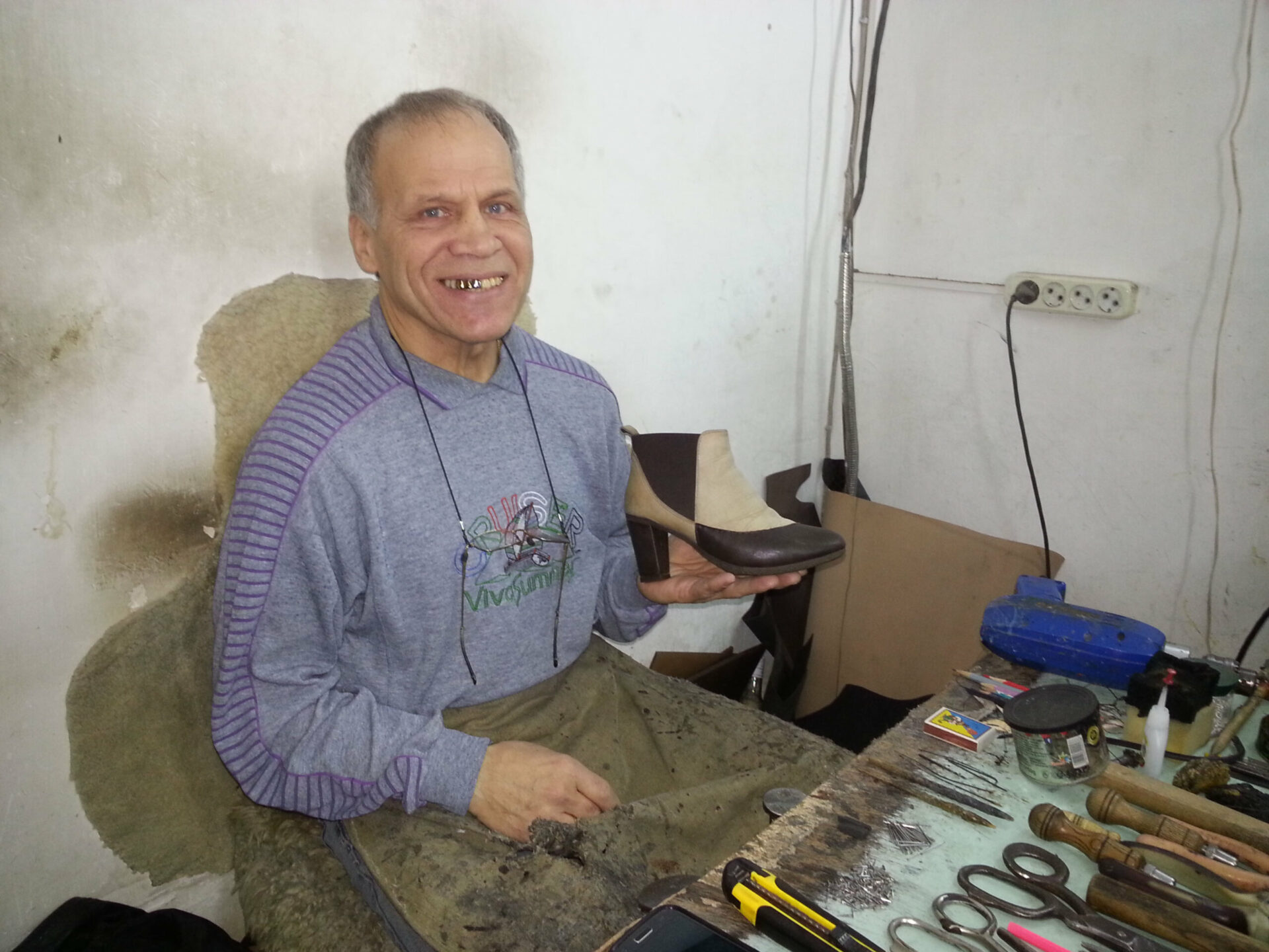 «Когда у людей скопилась немодная обувь, попробовал переделывать носы (из длинных – в короткие). Одна модель получилась, вторая, третья… Дело пошло. Потом к каблукам перешёл, подумал: почему бы их не поменять? И постепенно стал полностью переделывать модели. Люди довольны, и мне нравится. Если уделить внимание только переделке обуви, то за день могу её полностью закончить (если нет других заказов, а такого почти не бывает). Подошву меняю по одной паре в день, носки переделываю по две пары в день. Должно быть красиво и носко, чтобы человек остался доволен результатом. Стараюсь восстановить