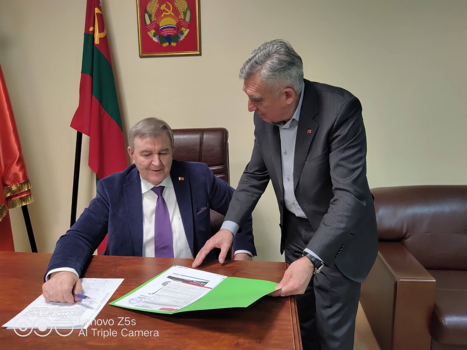 Был свидетелем интересного и полезного разговора Леонида Манакова с бывшим жителем Бендер, а ныне москвичом, заместителем генерального директора ООО «Геральдическая палата «Орден» Александром Колыбиным. В связи с предстоящими юбилейными датами – 30-летием образования ПМР и 75-й годовщиной Великой Победы – Александр Николаевич предложил рассмотреть некоторые его проекты праздничной атрибутики: