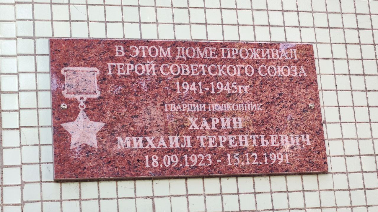 А ведь они и не подозревают, что стоит слегка обойти многоэтажку, создающую приятную тень во дворе, и их взгляду откроется памятная табличка с надписью «В этом доме проживал Герой Советского Союза 1941-1945 гг. гвардии полковник Харин Михаил Терентьевич». Под надписью – две даты «18.09.1923 – 15.12.1991». Красноармейцу исполнилось бы целых сто лет.