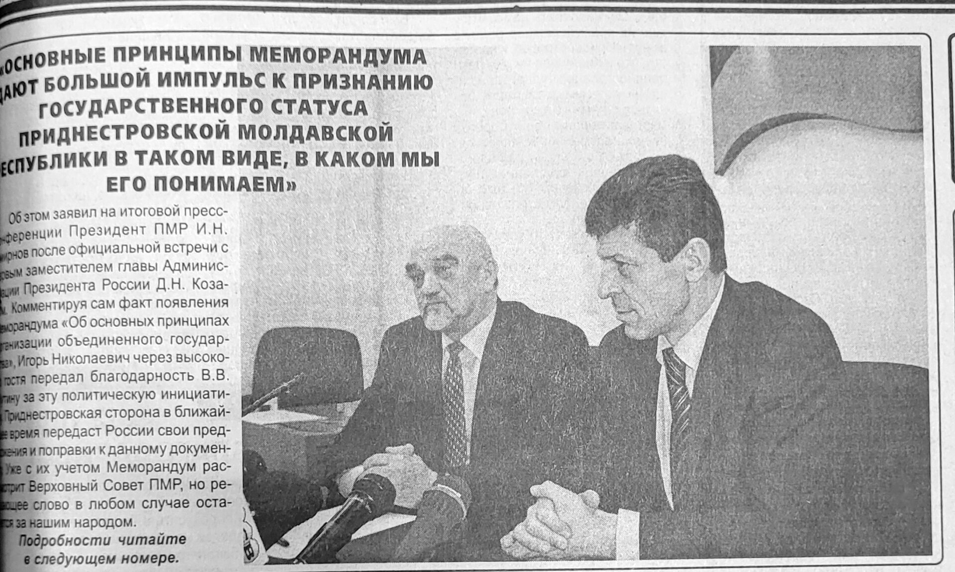 «Испытание на прочность». Так озаглавили подведение прошлогодних политических итогов в первом номере газеты 3 января 2004 года. «Мы хотели, чтобы здесь были мир и согласие, чтобы мы могли свободно работать и развиваться, а не находиться в постоянном ожидании – ради этого мы пошли на почти недопустимые уступки. И после этого получили прямой плевок в лицо», – прокомментировал ситуацию с неподписанием меморандума председатель ВС ПМР Григорий Маракуца. А вот что сказал директор Института стран СНГ Константин Затулин: «Надо различать в политике желаемое и действительное. У Воронина и не было в голове подписания договора. Он достаточно долго создавал видимость особых отношений с Россией. Делал он это с одной целью – побудить Россию сдать Приднестровье». Авантюра закончилась ничем.