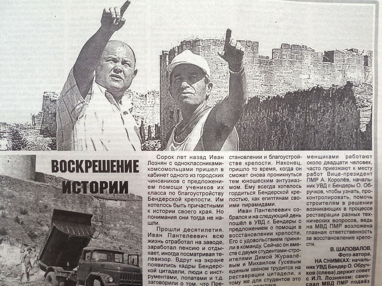 И ещё новость года (без преувеличения!) – масштабная реставрация Бендерской крепости. Из материала «Воскрешение истории» (№145 от 08.08): «Президентом ПМР И.Н. Смирновым принято решение о восстановлении и благоустройстве крепости». А 16 августа после векового перерыва в Бендерах отпраздновали полковой праздник 55-го пехотного полка, многие годы дислоцировавшегося в Бендерской твердыне.