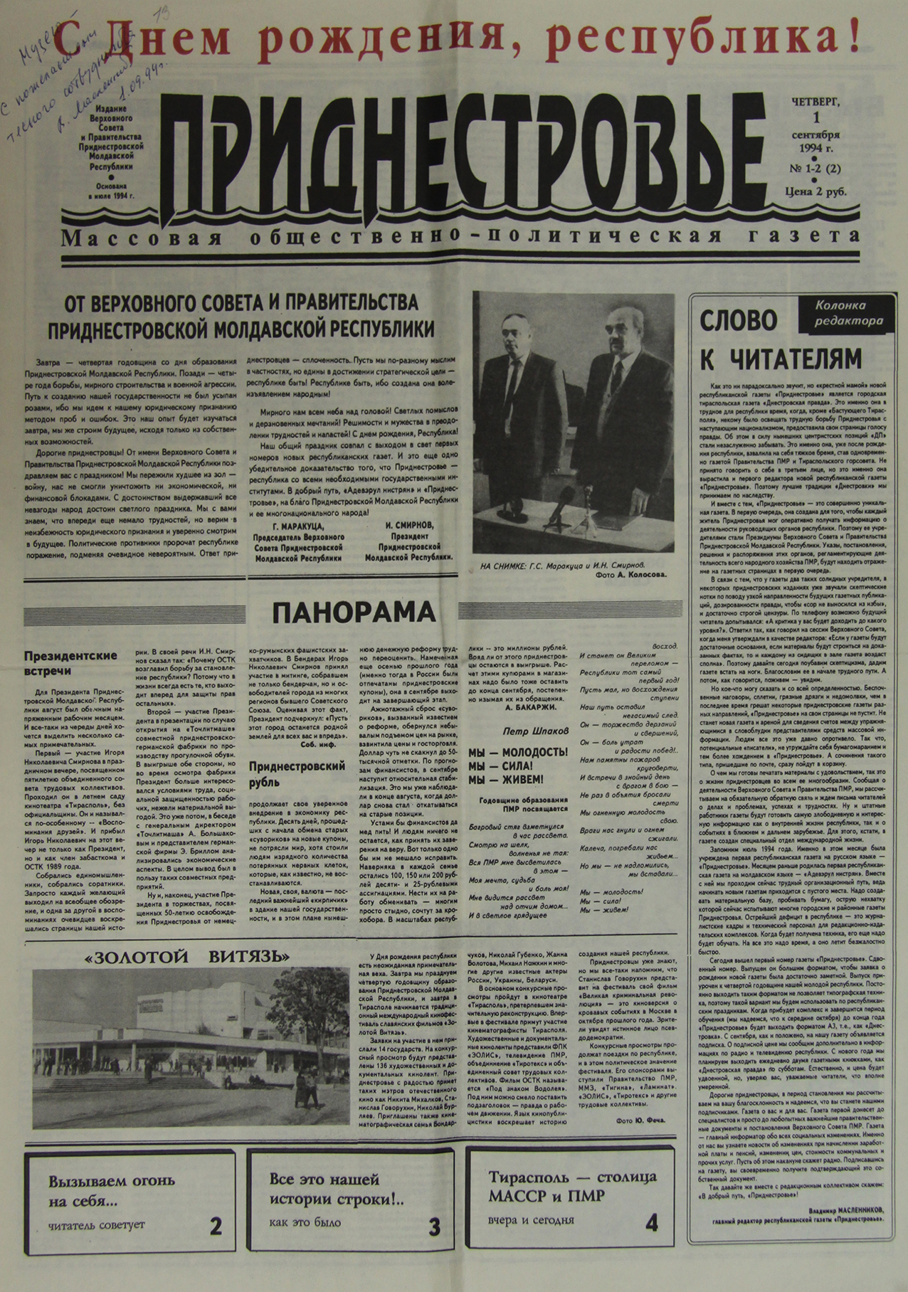 Первый сдвоенный номер получился небольшим. Всего четыре страницы, но зато в формате А2. Стоит напомнить, что тогда газеты выходили форматом А3, так что премьера «Приднестровья» оказалась во всех смыслах заметной. Мимо газеты трудно было пройти. Тут же открылась подписка на издание. «В добрый путь!» – пожелал газете первый редактор, и путь действительно оказался добрым, хотя и весьма ухабистым.