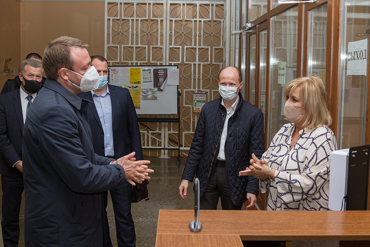 Далее совещание продолжилось уже в столичной школе №9. Там и установлен один из автоматических измерителей температуры с дезинфектором. Александр Мартынов совместно с членами координационного совета по образованию посмотрел, как работает прибор, на предмет его эффективности, и пообщался с руководством школы.