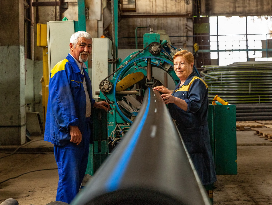 На фото: Анатолий Владимирович Готка, слесарь-наладчик, Наталья Александровна Григоренко, оператор экструдера машины по изготовлению полиэтиленовых труб.