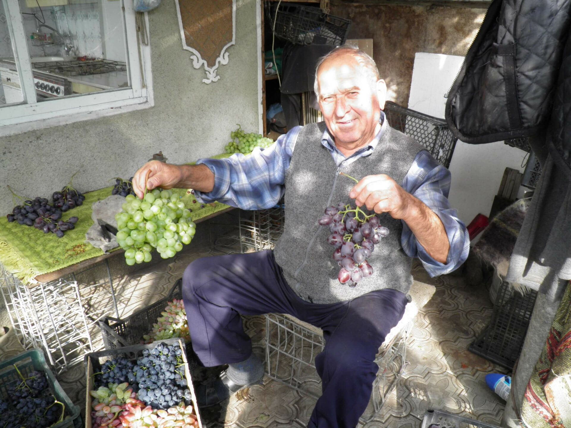 Мы застали Сергея Федосеевича за важным делом: он собирал живущим в Петербурге детям (кстати сказать, он дедушка и прадедушка пяти внуков и шести правнуков) посылку с виноградом. Летом, говорит, когда гостили, винограда вволю поесть не успели. Он любовно укладывал в коробки внушительные гроздья розового Оригинала, тёмно-синюю Молдову, бледно-сиреневый Граф Монте-Кристо, переливающийся нежно-зелёным перламутром Карабурно. Через пару дней посылка прибудет в северную столицу России, как солнечный привет далёкой родины и любимого деда.