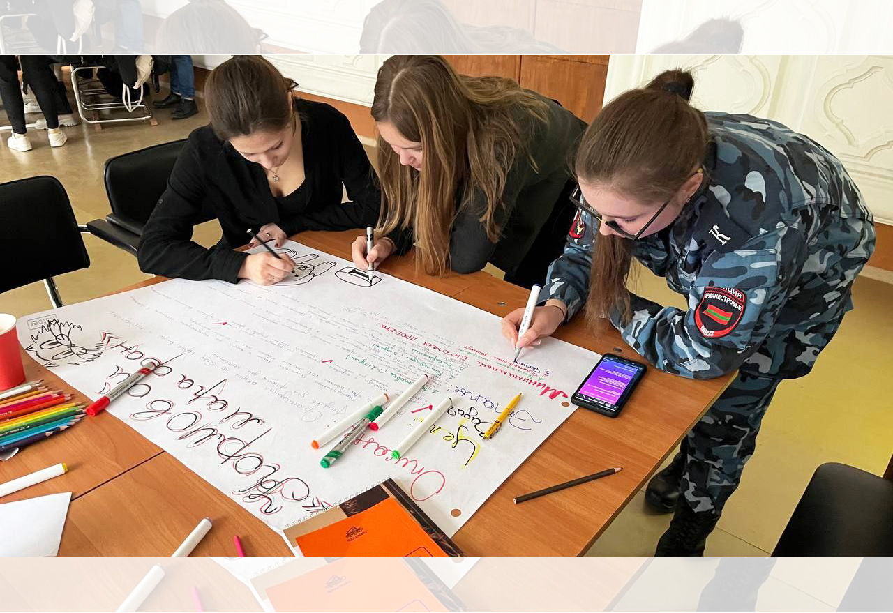 Волонтёры собрались в тираспольском техникуме информатики и права. Из милицейского вуза в школу прибыли четыре активиста. Курсанты и студенты ТЮИ сразу включились в маршрутную игру – ответили на вопросы об избирательном праве. Затем приняли участие в тренинге, в ходе которого учились нестандартно мыслить, развивали навыки сотрудничества. Основной задачей обучения стало создание добровольческого проекта. Волонтёры старались правильно ставить перед собой цели и задачи, а также учитывать риски при создании проекта.