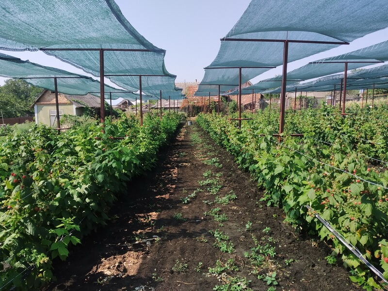 – Малину выращиваем при помощи капельного орошения, и в наших условиях очень сложно получить ее добротной без притеняющей сетки, – подчеркнул А. Арнаут. – Высокая летняя температура и постоянный суховей сжигают не только ягоды, но и сами растения. Учитывая это, изготовили специальную шпалеру с защитной сеткой, служащей затенением.