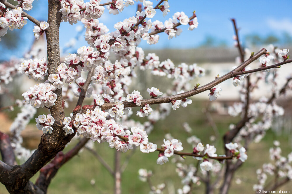 Абрикос в Приднестровье – вымирающий вид. За его судьбу ни один садовод не поручится. Раньше всех зацветает, ну и, как результат, чаще страдает от заморозков. В этом году весна вроде бы отсроченная. Зато в прошлом абрикосу досталось. Гуляю по двору, смотрю: ветки до сих пор чёрные, как бы обгоревшие. Лишь кое-где видны белые цветы, да и то какие-то чахлые. То ли дело алыча за углом – пышный тюрбан на голове знатного раджи. Ждём урожая!