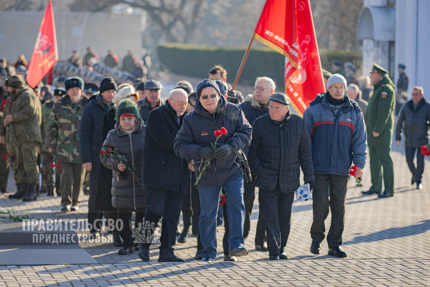 Под аккомпанемент оркестра Главного штаба Вооружённых сил Президент Вадим Красносельский, руководители органов власти возложили живые цветы к Вечному огню, могилам солдат и офицеров, исполнявших воинский долг в годы Великой Отечественной войны. Всего на мраморных плитах увековечены имена 1252 перезахороненных воинов, в том числе четырёх Героев Советского Союза. Красные гвоздики как символ немеркнущей памяти легли к монументам в честь воинов-«афганцев» и защитников Приднестровья, сообщает правительственная пресс-служба.