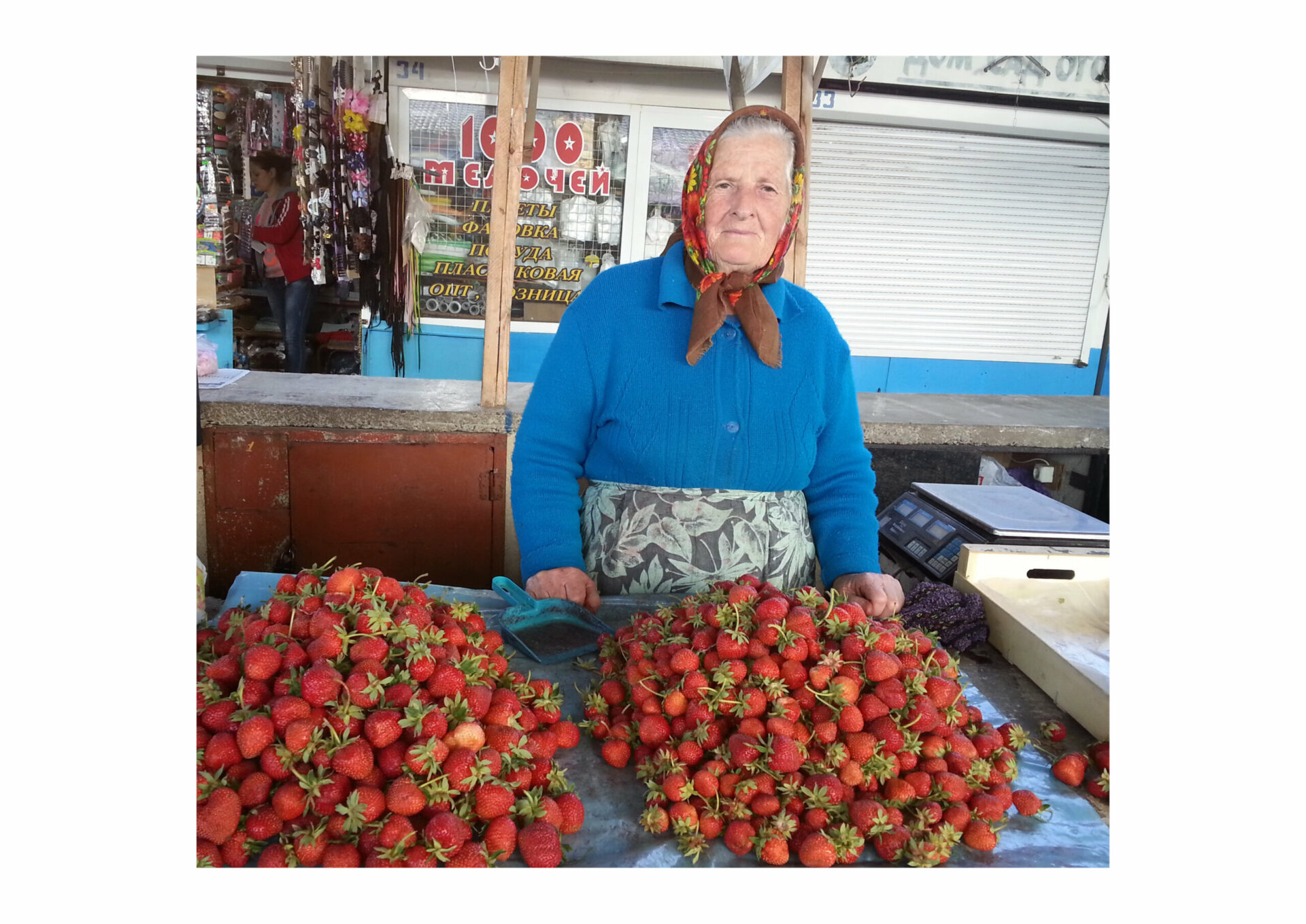Надо сказать, что первый её урожай стоил нескромно дорого – 70 рублей за килограмм. Сейчас же цена упала вдвое. Надо брать! «Клубника в этом году хорошая, много её, четвёртый раз собираем. Только бы дождей больше не было, иначе пропадёт урожай», – рассказала, взвешивая мне ягоды, продавец Мария Павловна Проноза. У неё в селе Копанка целые плантации клубники, аж 50 соток. Каждый день эта приветливая бабушка продаёт по 16-20 ящиков клубники, одна такая тара вмещает около 5 килограммов ягод. Собирать их пенсионерке помогают дочь с зятем, за что она им очень благодарна.