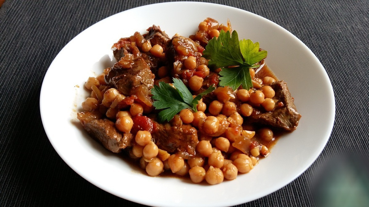 Перво-наперво нагут, как и все бобовые, надо размягчить, а именно: замочить в воде. Наша хозяйка вечером его тщательно промывает и заливает водой. Чтобы нут в готовом блюде был рассыпчатым, в воду добавляем чайную ложку пищевой соды. Важно не переборщить – ложку без горки, иначе нагут потемнеет. За ночь он хорошо набухнет. Пока нагут в воде, на сковороде поджариваем мясо, причём подойдёт как куриное, так и свиное, но лучше всего получается с домашней уткой. Обжаренное мясо – в отдельную тарелочку, и на том же масле поджарить лук, к которому обязательно добавить (это важно!) по столовой ложке сахара и томатной пасты – они и вкус, и цвет дадут блюду. Из казана, где замочен нагут, слить воду, в нее добавить соль, чёрный перец, лавровый лист, после хорошо перемешать и отправить обратно к нагуту, к нему же мясо и поджарку. Воды должно быть столько, чтобы она не только покрыла нут, но и была на 3 пальца выше. Варить следует 1-1,5 часа. В итоге блюдо получается ароматным, нагут – золотистым и мягким, но не теряющим форму – это его особенность! Пропорции на 6-литровый казан: 1,5 л банка нагута, не меньше 1 кг мяса, несколько средних луковиц.