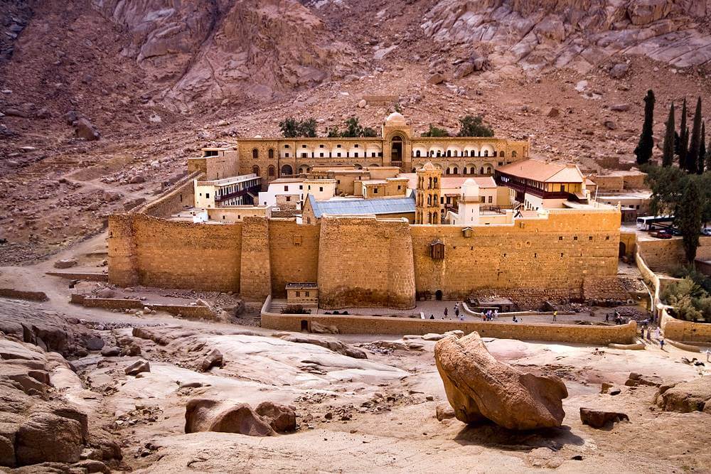 Чем же привлек нас монастырь? Главный исторический факт – монастырь св. Екатерины, расположенный в каменистой пустыне у подножия горы Синай на высоте 1570 м, первый монастырь христианского мира. Основан в IV веке. Его первая часовня, а всего их 12, возводилась в то же время, что и храм Гроба Господня в Иерусалиме. Она построена на том месте, где, согласно библейскому повествованию, Моисей разговаривал с Богом, вышедшим из горящего тернового куста и давшим десять заповедей. Он, собственно, и называется «неопалимая купина» и уже более 2000 лет растет на территории монастыря. Таким было и первоначальное название монастыря.