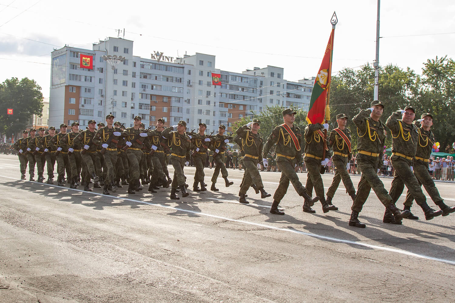 Военный парад прошел по центральной площади под командованием начальника Главного штаба Вооруженных сил ПМР Сергея Герасютенко, а принимал его министр обороны Олег Обручков. Горожане и гости столицы могли полюбоваться тем, как два десятка расчетов – более 1200 военнослужащих, сотрудников и учащихся учреждений и частей силовых министерств и ведомств республики – чеканили шаг по площади им. А. В. Суворова.