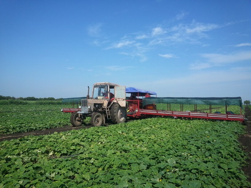Ещё в прошлом году ООО «Агрикол ППК» закупило специальную платформу, которая крепится к трактору. На ней есть «лежаки» (лежачие места), по шесть с каждой стороны бурчащей машины. На них, лежа под теневым навесом, работники и собирают огурцы. Трактор едет небыстро – за час проходит 300 метров, чтобы люди успевали собирать зелёный овощ.