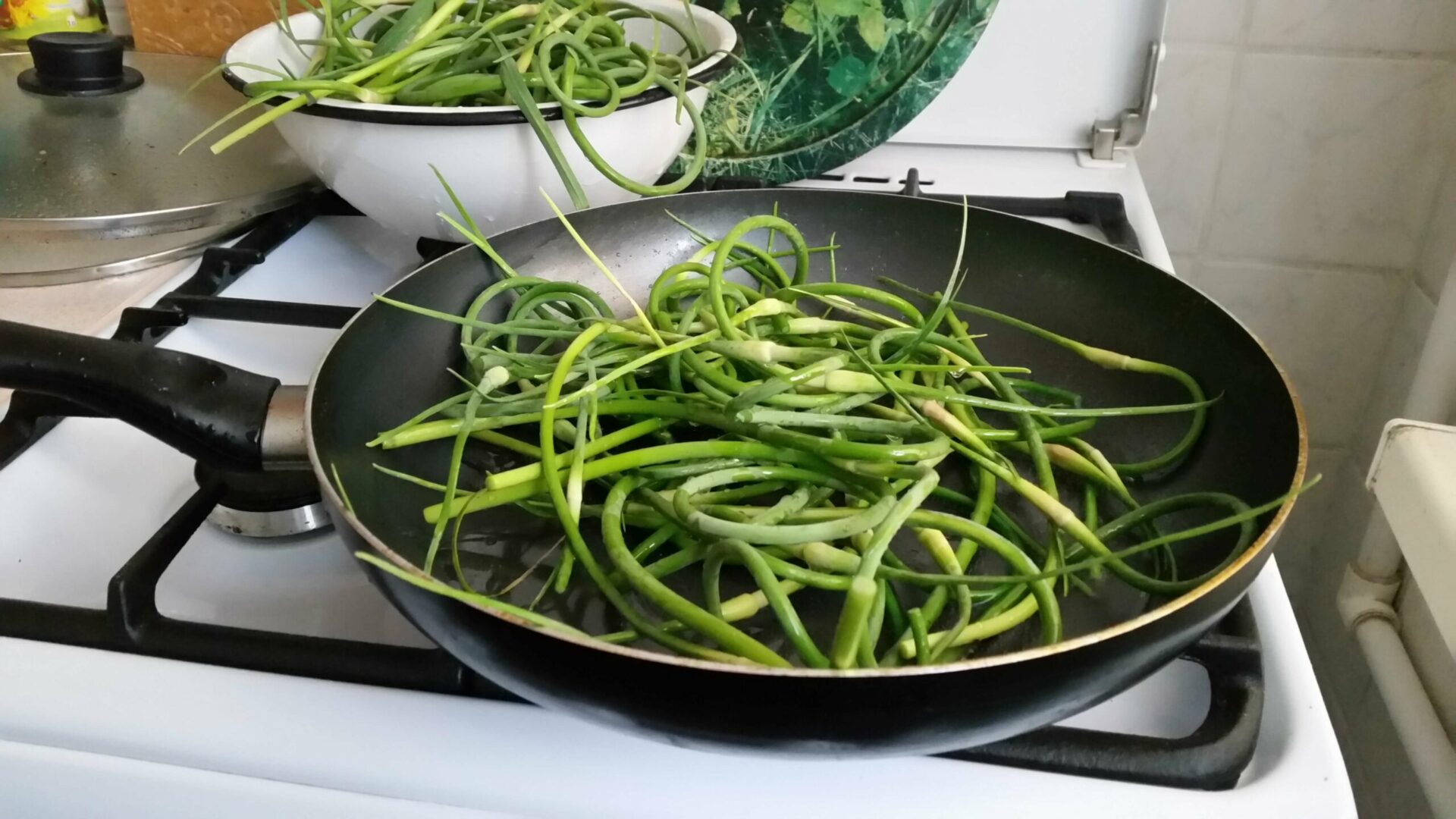 Уже на кухне стрелки были промыты под струей воды, разрезаны на несколько частей и подсолены по вкусу. Жарка на сковороде с разогретым подсолнечным маслом заняла пять минут. На скорую руку к ним сделали соус, для которого слегка прожаренная до золотистого цвета мука была смешана со сметаной и измельченной на терке брынзой. Стрелочки получились хрустящими и ароматными.