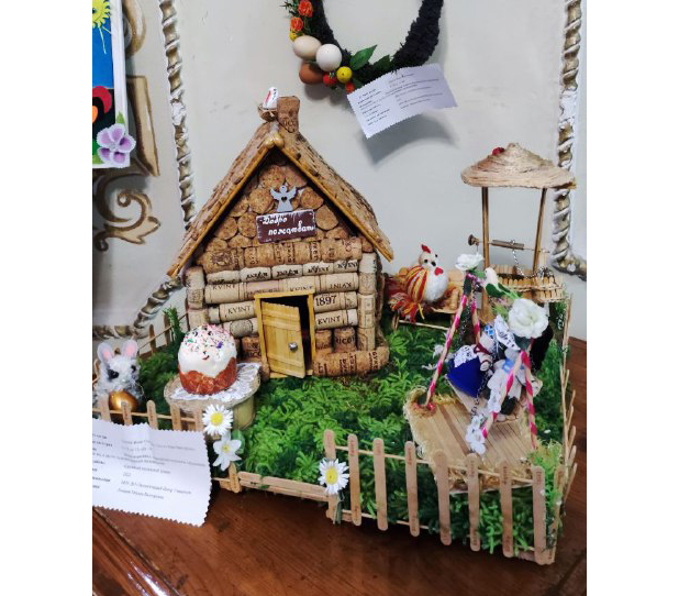 Были на выставке, конечно, и работы масштабнее и серьезнее – Иван Лесник и Иван Теплов из экологического центра учащихся создали из пробок и палочек от мороженого дом и сад, заботливо, с учетом каждой детали, воссоздали даже колодец, застелили воображаемый двор зеленым ковром из ниток и добавили главное – кулич, курочку-несушку и двух хозяев. Работа ребят вызывает восхищение и желание рассмотреть композицию, а едва заметная деталь – пара белых голубей на крыше дома, будто обещает зрителю – все обязательно будет хорошо.